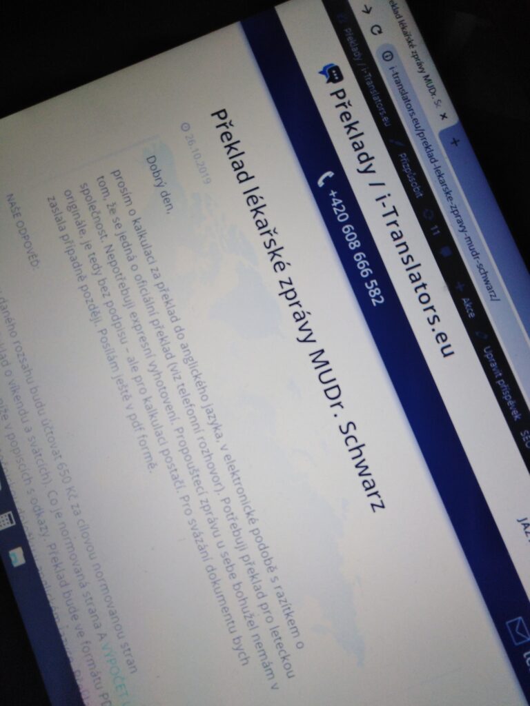 Velmi často se stává, že pacienti nás kontaktují s požadavkem velmi expresního překladu lékařské zprávy / zpráv do angličtiny nebo němčiny. Takový expresní požadavek vypadá tak, že klient si přeje mít do 24 hodin přeloženo např. 8 stran lékařských zpráv psaných hustou sazbou textu, které ve výsledku mohou činit až např. 12 stran normovaných. My takový překlad ve zkráceném termínu jsme schopni dodat. Lékař na textu pracuje non stop.